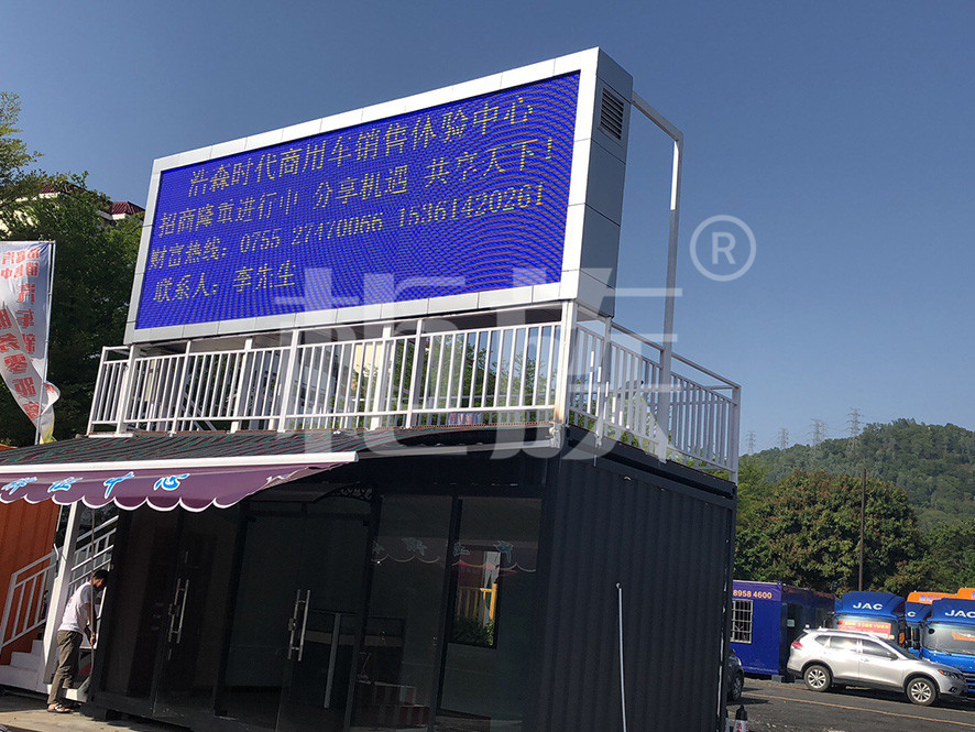 小而精的辦公室,一樓辦公帶遮陽棚,側(cè)面樓梯可達(dá)二樓平臺。承重力強,箱頂豎有大型LED廣告屏。室內(nèi)設(shè)衛(wèi)生間,可兼任住宿和短時休息用途。