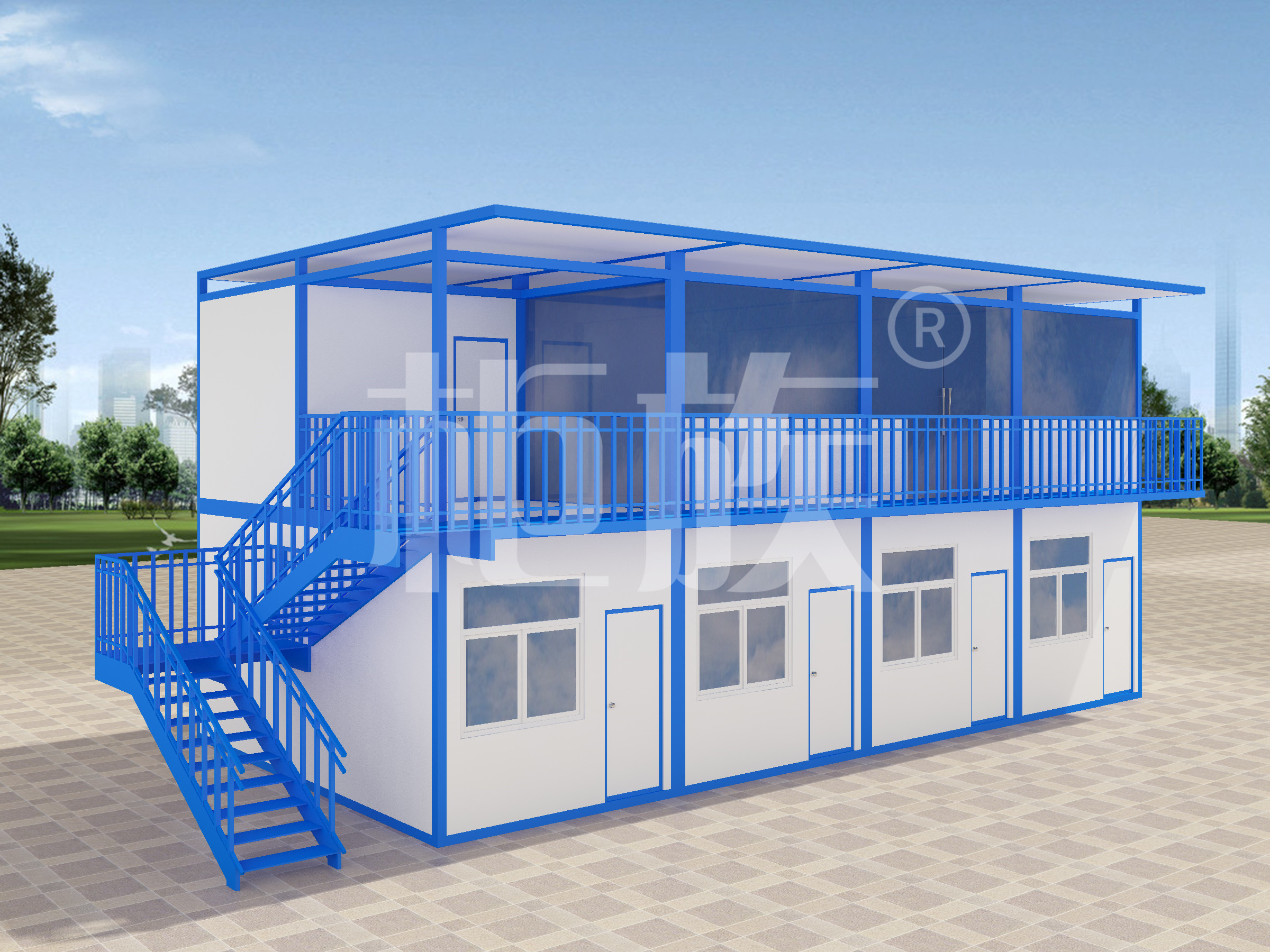 多個箱體拼接而成,藍白色的外觀簡潔流暢。工廠生產、成品直接運輸至使用場地,配套設施齊全,即到即用。