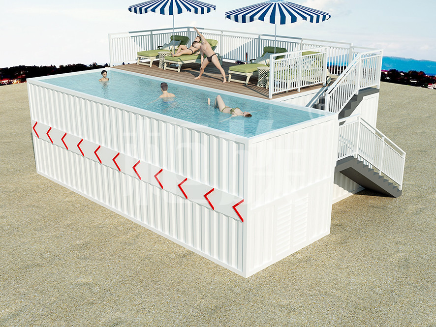 集裝箱泳池可以完全在工廠預(yù)制完成,占地小、造價(jià)低,適合庭院、海邊的度假地、以及其他公共游樂(lè)場(chǎng)所使用。